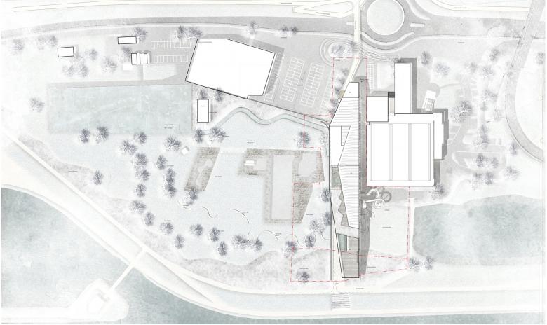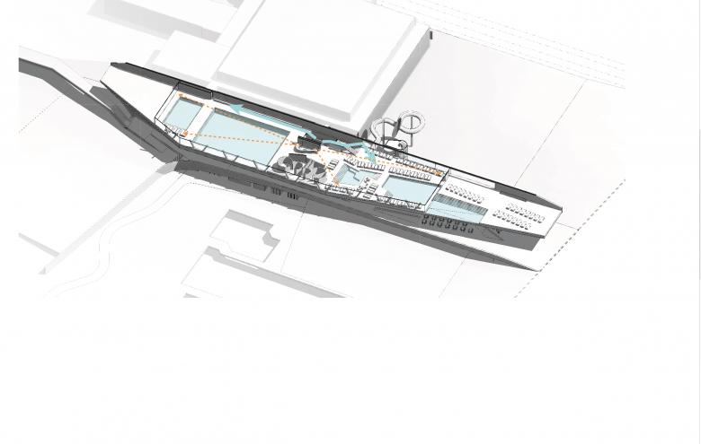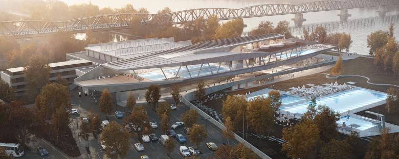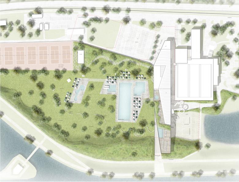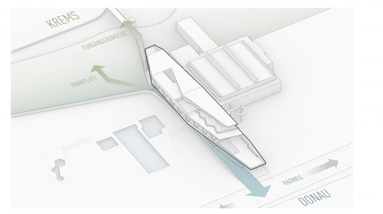Es wird in seiner schlanken Kompaktheit gestärkt als linearer Erlebnisraum zwischen der Strandbadstraße und der Doktor-Franz-Riel-Promenade entlang des Donauufers. In all seinen Ebenen wird die Beziehung zwischen der Stadt und der Donau erlebbar gemacht, sei es in der aktiven Begehung und Benutzung der verschiedenen Abschnitte, sei es einfach in seinen visuellen Anknüpfungen an die beiden wesentlichen Pole dieses urban-landschaftlichen Gefüges. Darüber hinaus ist auch die Option der direkten fußläufigen Anbindung an die Stadt mithilfe einer Brücke über die Bundesstraße B3 konzipiert, die an den stadtseitigen Fuß- und Radweg anknüpft und sich in die Kreisverkehrskonzeption mit der Bahnunterführung Richtung Stadtzentrum einschleifen lässt.