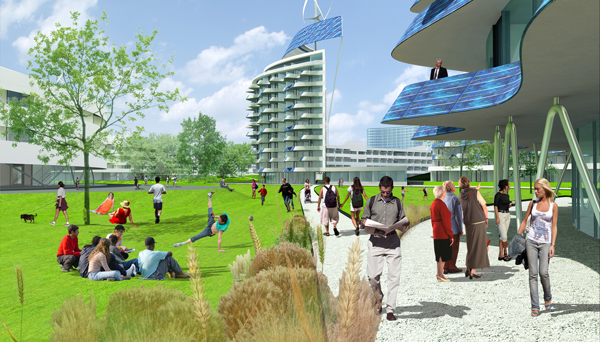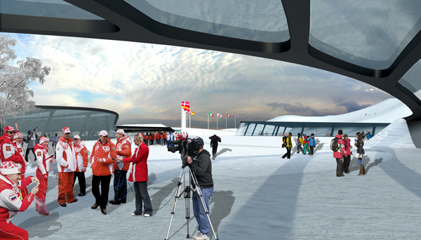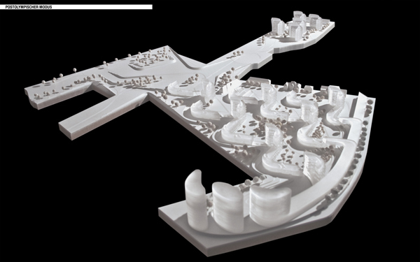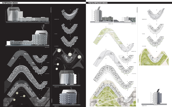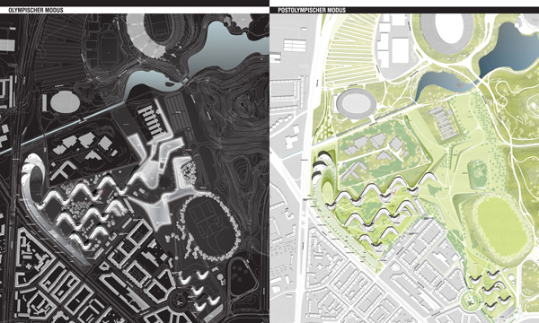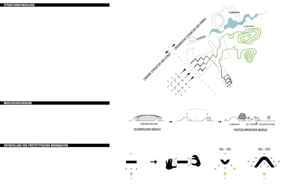 Die Bauwerke geben den Rhythmus für die Landschaft vor, rahmen die Naturräume, gliedern und organisieren den Freiraum und werden ebenso schließlich Teile der Parklandschaft selbst. Die Wohnbebauung mit ihrem stark mäandrierenden Gefüge reflektiert die beiderseits der Dachauer Straße vorhandene Blockrandbebauung, greift deren Grundraster auf und wird zugleich überformt von den bereits erwähnten topografischen Verwerfungen der sich durchschiebenden Naturlandschaft. Hofartige Zwischenräume mit unterschiedlichen Atmosphären entstehen, deren Zonierungen sich schließlich bis in die Struktur des Gebauten fortpflanzen. Weiterhin werden auch die vorderhand temporär überdachten Einrichtungen (dining, sports, recreational center, etc.) später befestigte Freiflächen für Aktivitäten jeder Art, deren Ausübung harte Oberflächen verlangt (Ballsportarten, Skating, etc.). Überhaupt bleibt ein Teil der landschaftlichen Auffaltungen mit den integrierten Servicebereichen (Catering, WC-Gruppen, etc.) auch weiterhin verschiedenen Freiluftveranstaltungen erhalten und wird damit ein Teil der hier bereits vorhandenen Open-Air-Kultur.