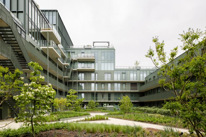 The outdoor spaces, designed by LAP Landscape & Urban Design, emphasize the strong connection between interior and exterior that is central to the overall design. The shared courtyard atop the parking garage creates a peaceful oasis. Crowning the building, the penthouses feature spacious, terraced rooftops that rise in a green, stepped formation, providing views of the water, the cityscape, and the inner garden.