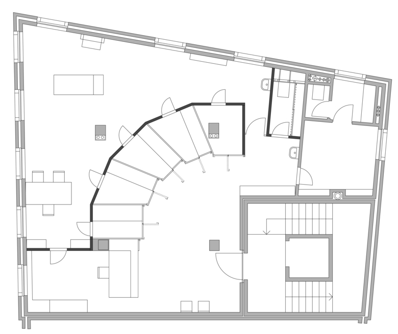 Der Kernpunkt des Projektes umfasst den möbelartigen Einbau von fünf Umzieh- und Untersuchungskabinen, die mit dem Empfangskorpus zu einem markanten Raumkörper zusammengefasst werden. Der Raumkörper unterteilt die Praxis in Eingangs- und Behandlungsbereich. Die Kabinen erweitern den Eingangsbereich und dienen zugleich als Filter zum dahinterliegenden Behandlungsraum.