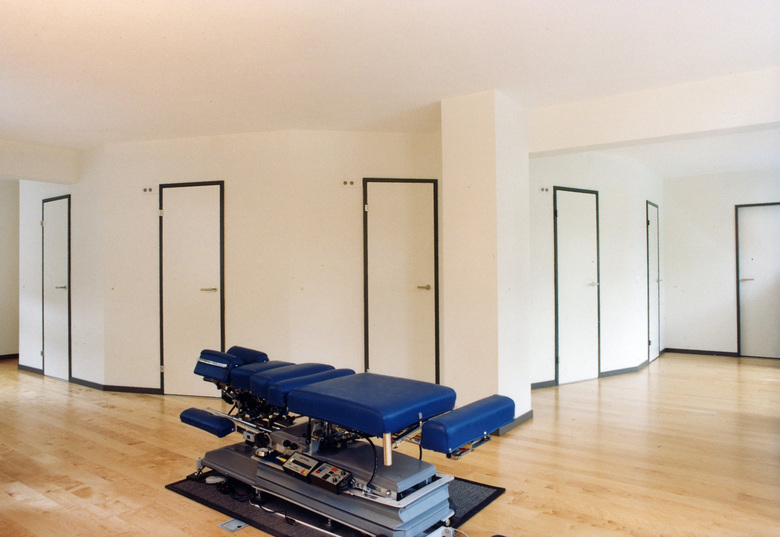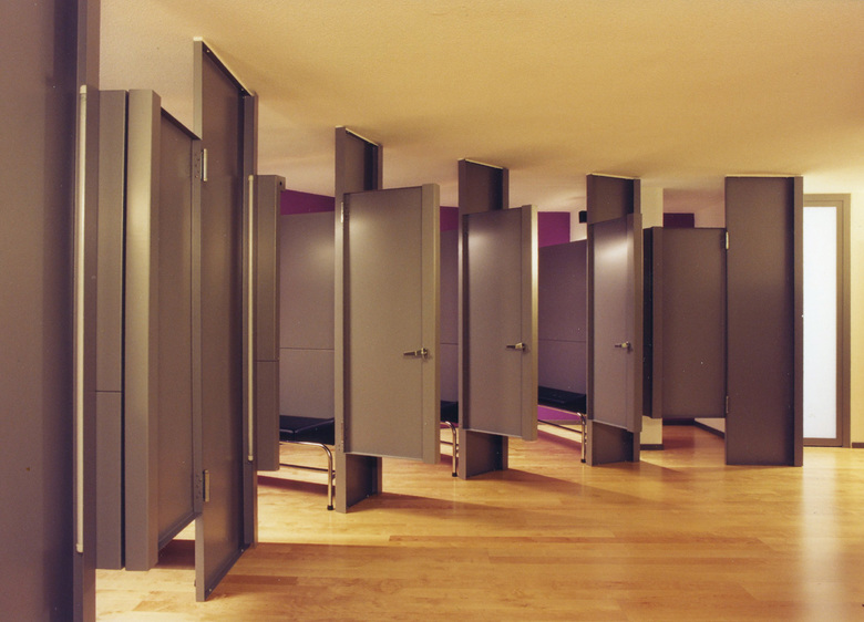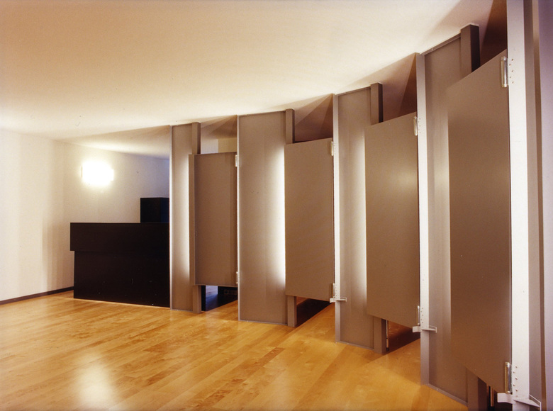 In Anlehnung an das Metier des Chiropraktikers werden die Kabinen wie Teile eines Skeletts ausgebildet. Den Gelenken einer Wirbelsäule vergleichbar reiht sich Einheit an Einheit, bleibt aber als Teil eines Ganzen ablesbar. Die fragmentarische Erscheinung wird über die indirekte FL-Beleuchtung unterstrichen. Trennwände und Türen sind aus einbrennlackierten Metallblechen ausgeführt. Wie bei Kuchenblechen werden die Ränder der Bleche einfach oder doppelt umgefalzt, wodurch die weichen Bleche ihre statische Festigkeit erhalten. Die konstruktiv bedingten Blech-Fälze bestimmen die architektonische Erscheinung und dienen sowohl als Türgriff, Türanschlag, Befestigungsort der Schwingscharniere wie der unsichtbaren Plazierung der Leuchtkörper.