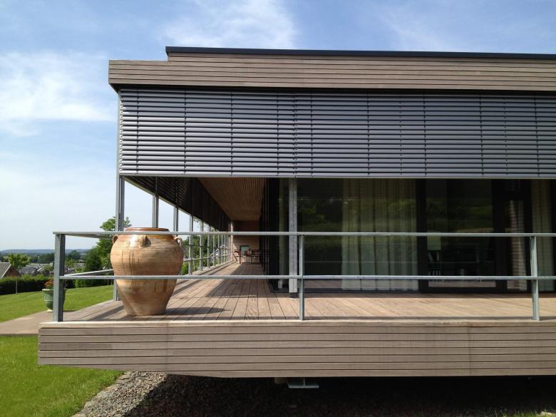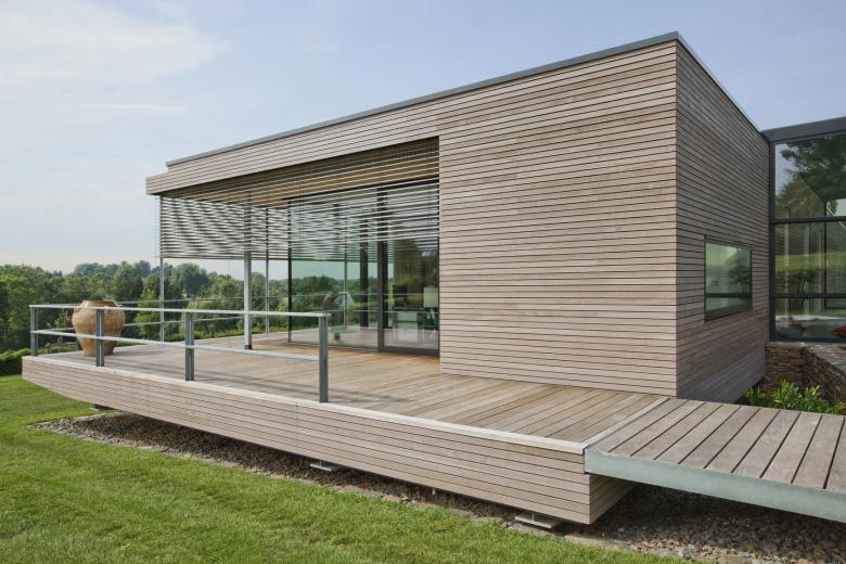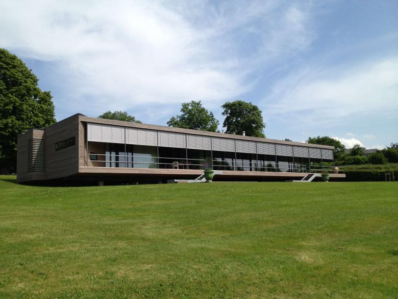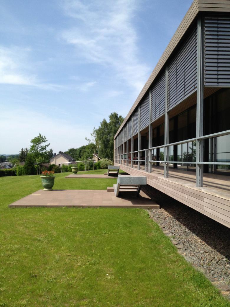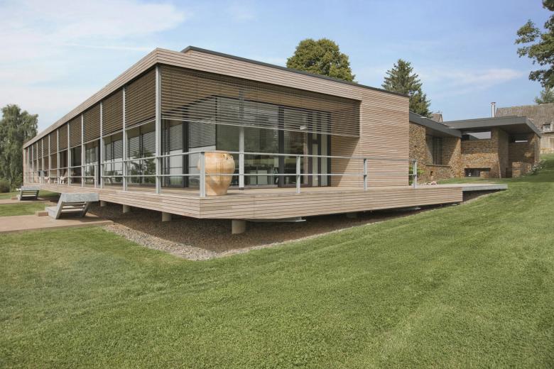 Techniques: VMC, chauffage sols et murs par chaudière à pellets, panneaux photovoltaïques, domotique, toiture végétalisée.