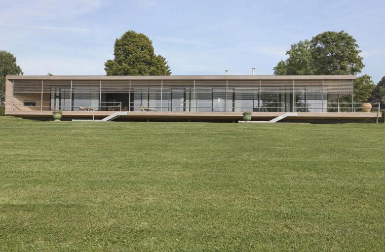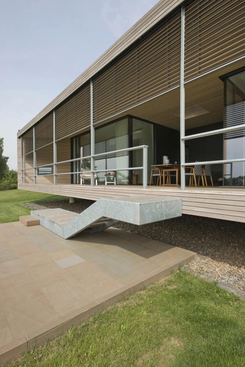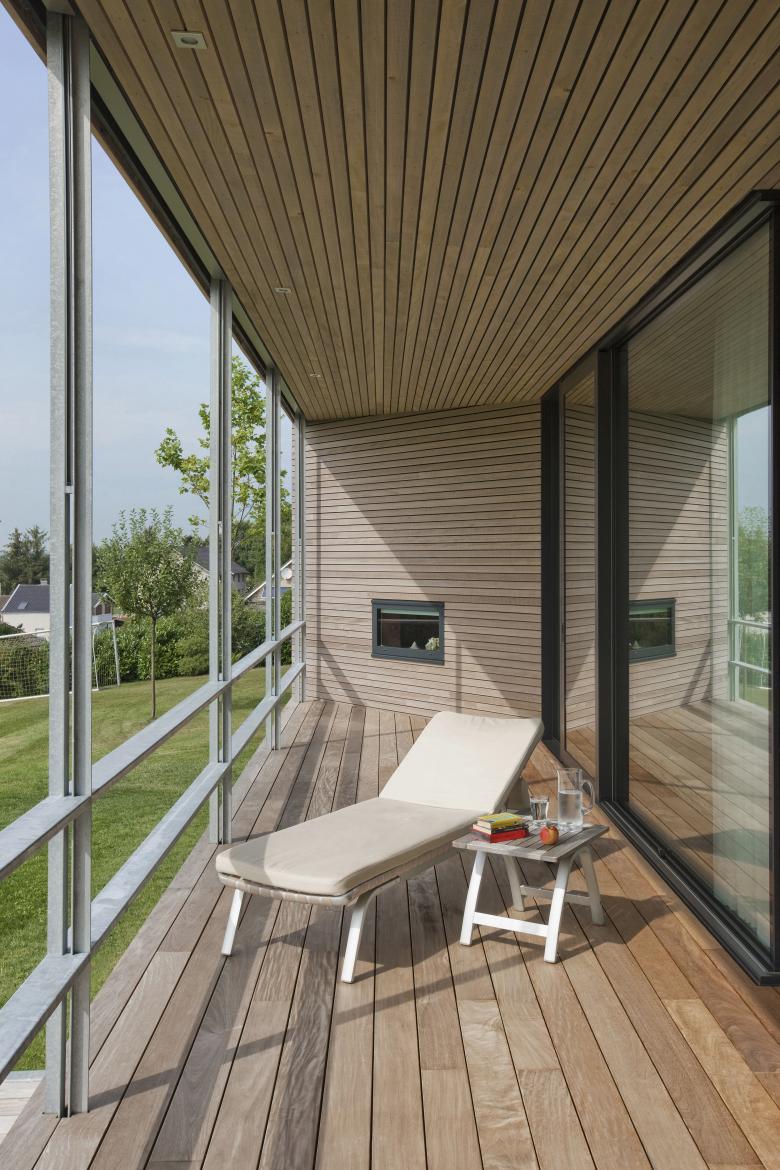 La seconde aile orientée quant à alle nord/sud se liaisonne avec la première par un volume entièrement vitré, on y retrouve le hall d'entrée et une piscine qui accompagne cette zone côté sud. Cette aile réalisée en ossature bois se détache du sol et renferme les espaces de vie, le bureau bibliothèque ainsi que la suite parentale. Une coursive extérieure couverte régule les surchauffes à l'aide de stores mécanisés par domotique. Un patio couvert détache le séjour de la zone de nuit. Deux terrasses implantées à même le sol sont rendues accessibles par l'intermédiaire de deux escaliers auto portants en acier galvanisé.