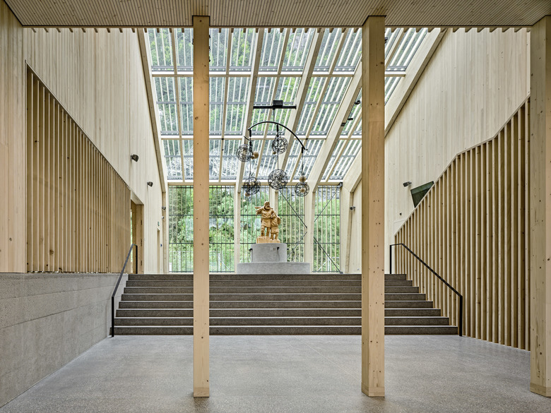 Die leichte Holzkonstruktion ruht auf einem mineralischen Sockel. Die durchlässige Fassade des Holzbaus ermöglicht einen fliessenden Übergang zwischen Innen und Aussen. Die Umgebung ist in allen Räumen sichtbar und spürbar. Umgekehrt strahlt das Innenleben nach aussen und der Baukörper leuchtet einladend.