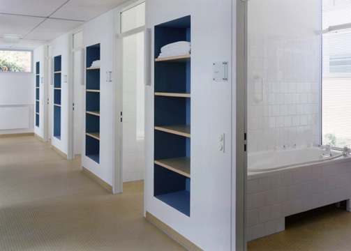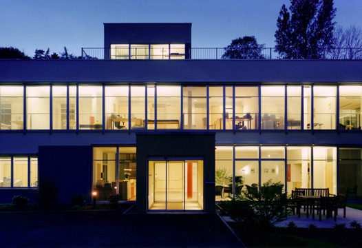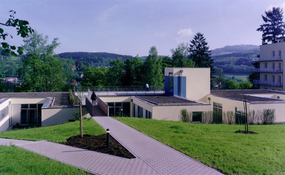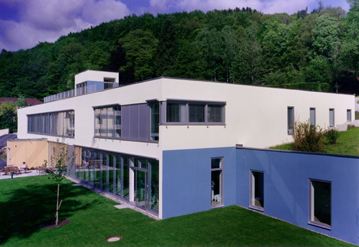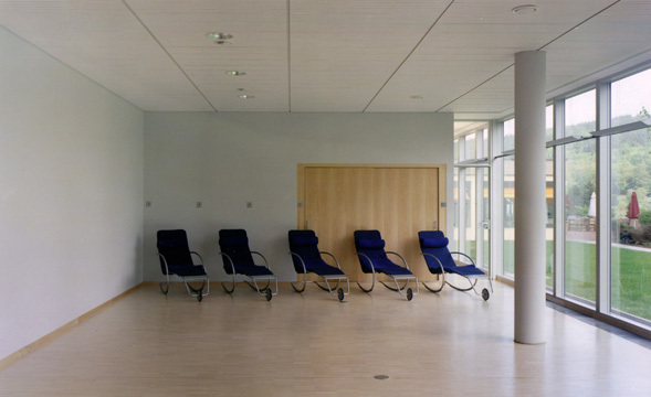 Neubau Empfangs- und Gesundheitsgebäude in den Hängen der Röhn mit Tageslicht in allen Räumen.