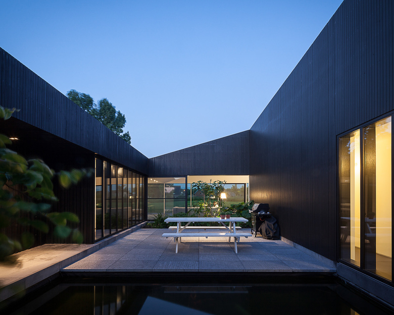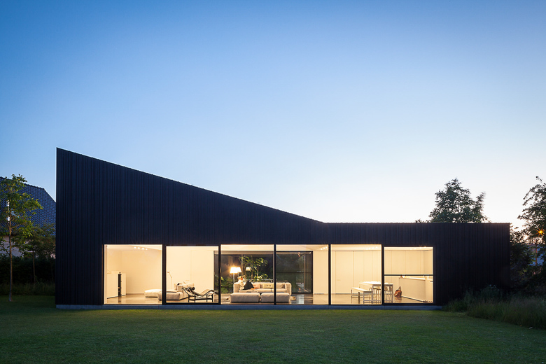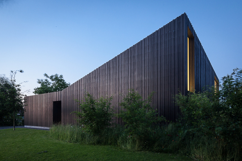 The facade, covered with inland wood that has undergone a thermowood treatment, is unobtrusive yet playful. Although the width of the wooden slats are the same everywhere, their thickness differs. This brings about a very unusual lightening or darkening effect depending on your point of view. Black is never black on this house but ranges from a timid brown to a dark grey. And because of the visual absence of a fascia hidden behind the slats, the roof top seen from the side displays an intriguing uneven look. Like teeth on a carpenter’s saw. Along the green patio the architect has chosen a different option. Here the wood panelling used along the walls all have the same width and thickness so as to create a more inviting, a more homely, more living room like atmosphere than the rugged facade on the outside.