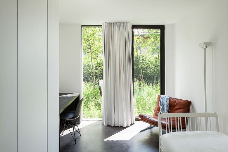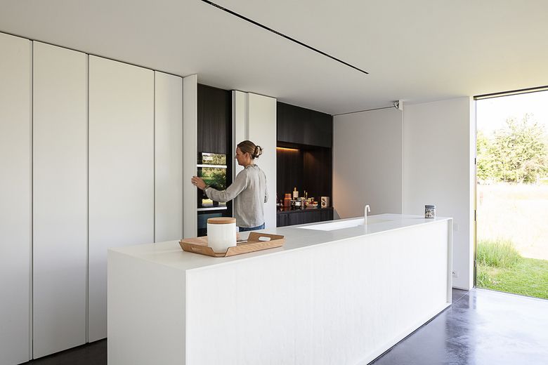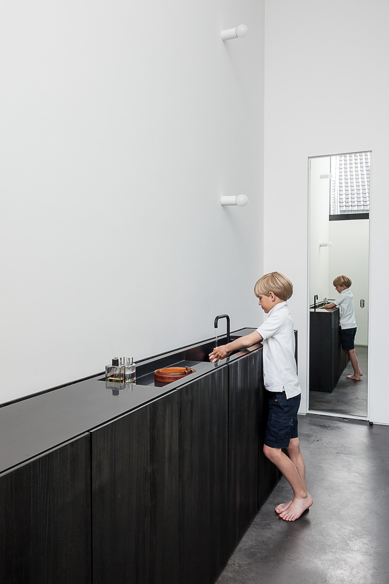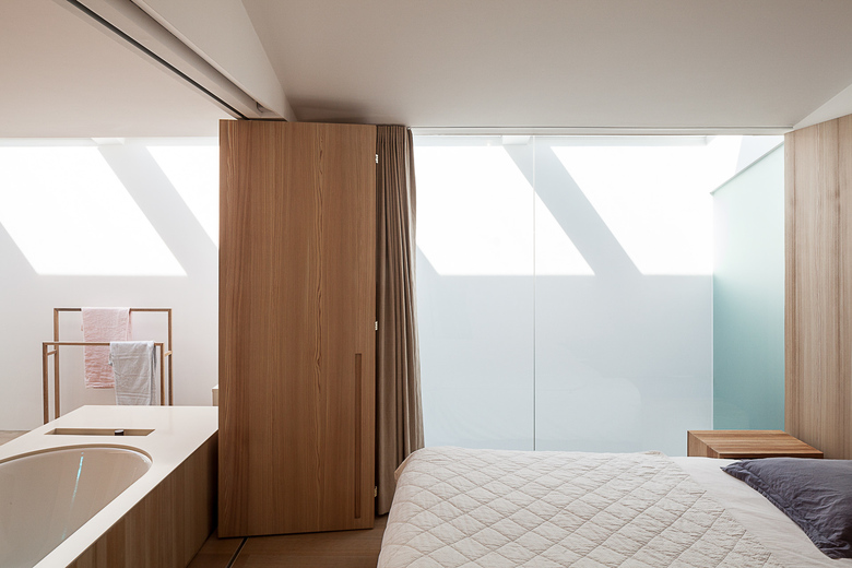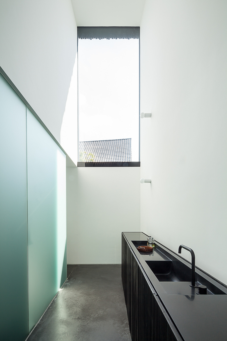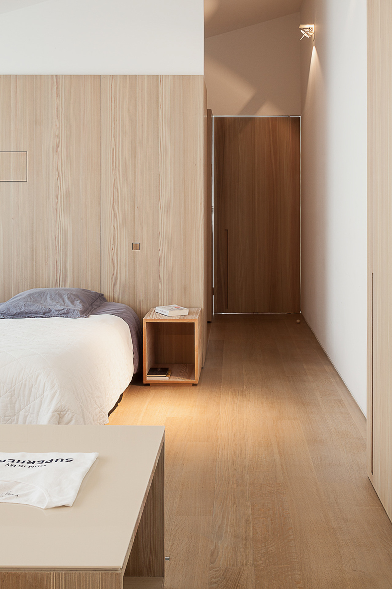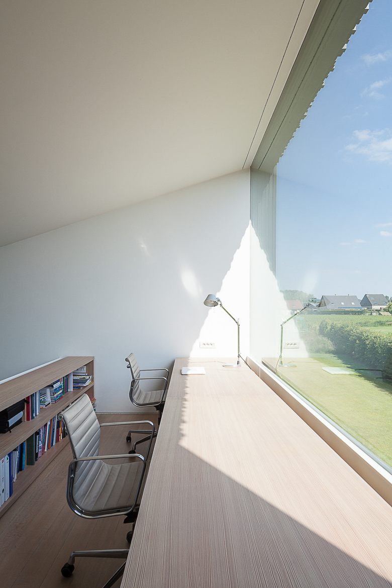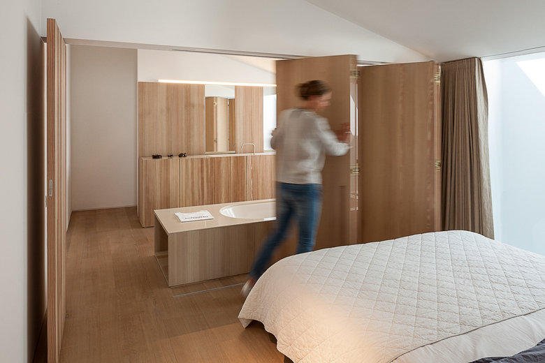 The kitchen is almost completely hidden from view. Behind white cupboards of uneven width one finds the cooking area and the integrated fireplace both covered in sanded larch wood in a rich dark grey. The same dark coloured sanded larch wood can be found in the downstairs bathroom echoing the sparse catalogue of materials the architect has limited himself to. Upstairs this limited palette is enriched with the use of oak on floor and bathroom cupboard walls giving these quarters a more homy and intimate ambiance..