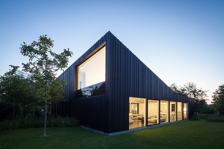 All living areas (bedrooms, bathrooms and living room) are oriented towards the South. This brings in the sun in abundance. Here it seems as if the idea of wooden slats has been reinterpreted in the form of blinds offering the people inside intimacy and privacy. All windows are made up of glass glued onto a thin frame. This leads to clean lines and an almost unobstructed view outside. For the walls the architect has chosen fixed heights so that from the inside the playful inclination of the ceiling is emphasised and craftfully articulated.