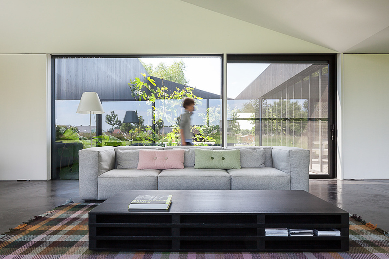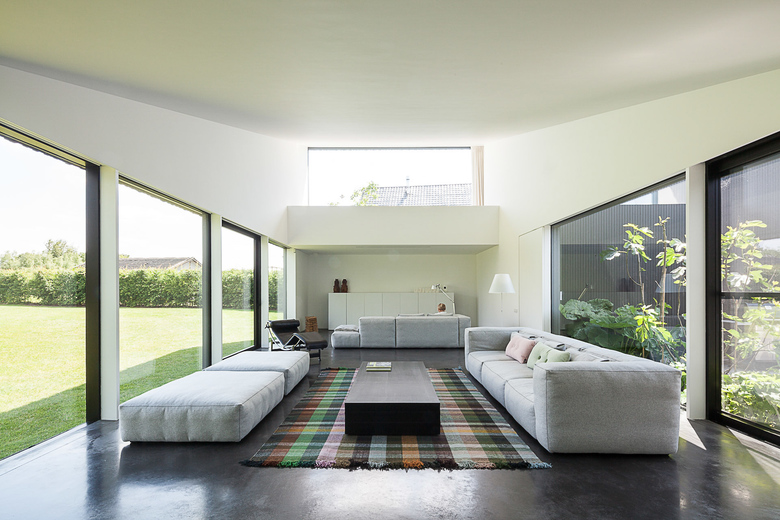 The client initially dreamt of a house made up by different volumes centred around a green space. The architect however countered this idea of independent volumes by coming up with the concept of one building with the feel of separate buildings. On a rectangular floor plan (measuring 18m by 18m) around an interior garden of which all living spaces benefit he constructed a residence both intimate and open.
