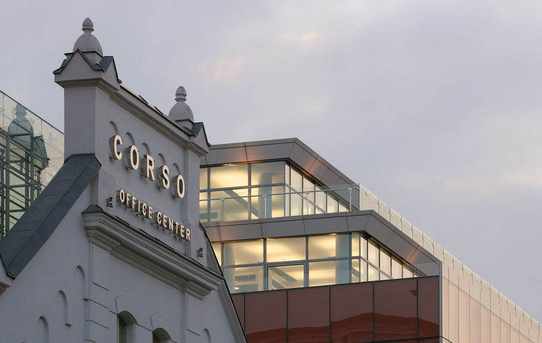 Arquitectura comercial moderna, fachada de vidrio formada por ventanales conectados a paneles periféricos especiales recubiertos por estuco veneciano y un atrio central acristalado con zonas ajardinadas. Corso II es un ejemplo representativo de centro de negocios que proporciona un ambiente de trabajo de gran calidad, posibilidades de distribuir flexiblemente el espacio, show-rooms modulares a nivel de calle, restaurantes y un parking subterráneo a tres niveles.