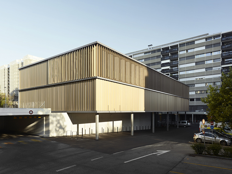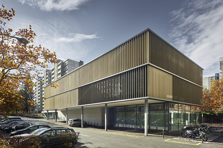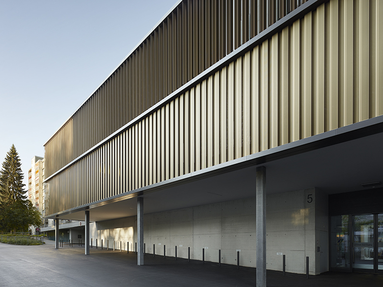 Der Neubau wird zurückversetzt vom Scheibenhochhaus des Fellerguts als eigenständiger Kör-per positioniert. Der Zentrumshof wird aufgewertet, die städtebauliche Situation geklärt und nachhaltig verbessert. Das Bürogebäude ist als zweigeschossiger Pavillon mit einem Sockelge-schoss konzipiert. Das bestehende Untergeschoss bleibt erhalten. Eine Fassade mit bronzefar-benen Vertikallamellen bindet die beiden Obergeschosse optisch zusammen. Die vorgehängten, gelochten Metalllamellen umgeben den Pavillon wie einen Vorhang. Die perforierte Schicht ge-währt den Ausblick aus dem Inneren, filtert jedoch das Sonnenlicht und den Einblick von Aussen.