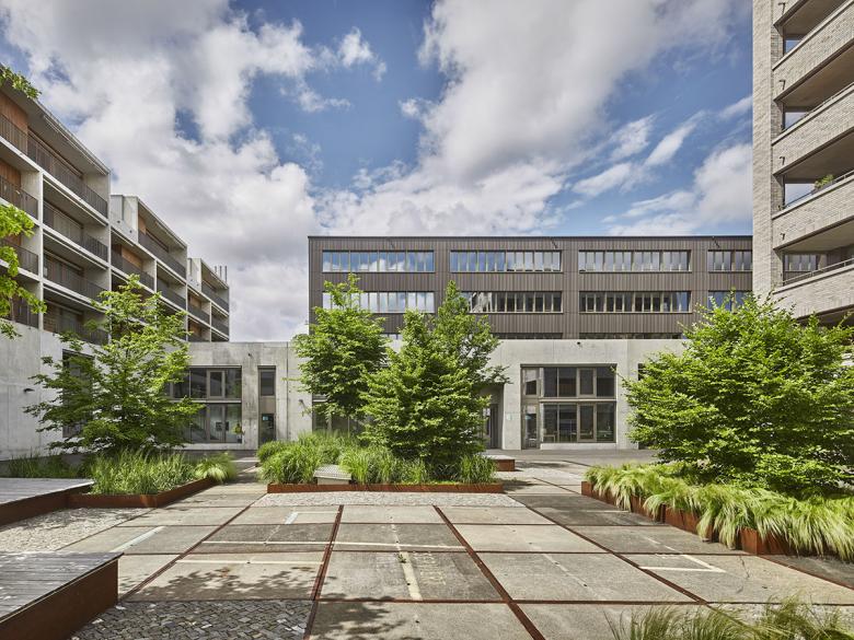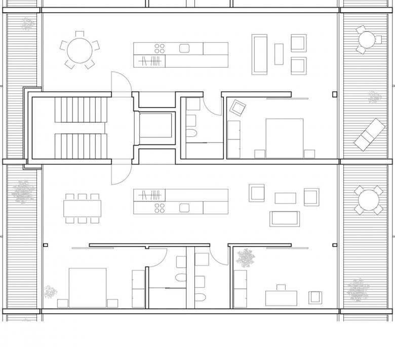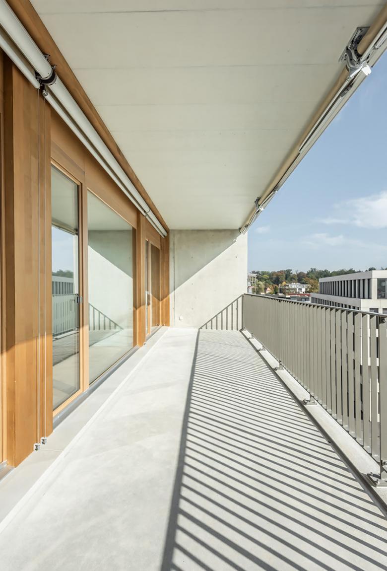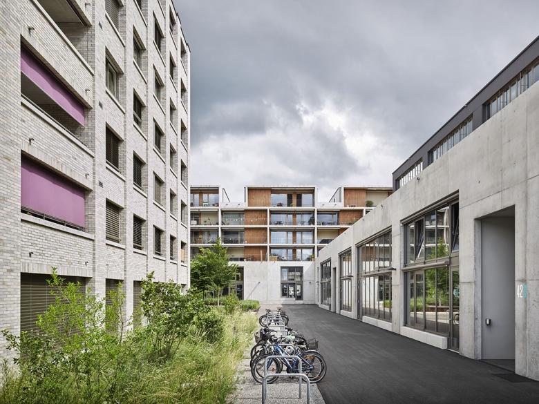 Die 26 Wohnungen sind als Zweispänner organisiert und profitieren von der zweiseitigen Belichtung. Der durchgehende Wohnraum wird durch die freistehende Küche spannungsvoll zoniert. Durch die Abtrennung der Zimmer mit grossen Schiebetüren entstehen offene, fliessende Räume. Die Grundrisse weisen durch die Loggien, Dachterrassen und den Bezug zum Innenhof ein hohes Mass an Raumqualität und Individualität auf.