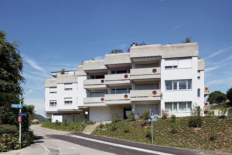 Der typische 70er-Jahre-Bau brauchte 2011 neue Küchen und Bäder, eine sanfte Auffrischung der Oberflächen und ein freundlicheres Gesicht. Dafür wurden die schweren Sichtbetonstürze der Balkone gekappt und jeder Balkon erhielt ein Bullauge. Die leuchtend orangen Farbakzente im Inneren und Äusseren deuten auf die Farbvorliebe der Siebziger.