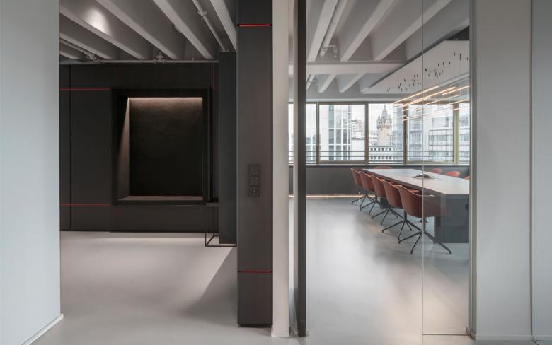 Da die neuen Büroräume Loft-Charakter bekommen sollen, verzichten wir auf abgehängte Decken. Unterhalb der hell gestrichenen Geschossdecke verlaufen Versorgungsleitungen und unterschiedlich hohe Betonunterzüge. Die schwarzen Paneele der Wandbekleidung enden auf einheitlicher Höhe unterhalb des tiefsten Unterzugs, sie bilden eine Art Horizontlinie. Schwarze Stromschienen zeichnen sich ebenfalls kontrastreich vom hellen Deckenraum ab.