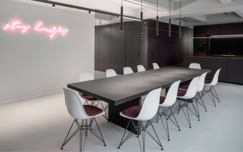 Der gestalterische Hauptaugenmerk unseres Entwurfs liegt auf den Treffpunkten Café-Bar und Büro-Küche. Bewegt man sich nach Betreten der Bürofläche auf den Empfang zu, hat man Blick auf die gegenüberliegende Jugend-Kultur-Kirche Sankt Peter. Der Empfangstresen ist nicht bloß ein Begrüßungsort, sondern auch eine Café-Bar, an der sich Gäste und Mitarbeiter treffen. Auf der Südseite des Gebäudes befindet sich die Büroküche. Dort steht in pinkfarbener Neonschrift auf weißer Wand das vielsagende Motto "stay hungry".