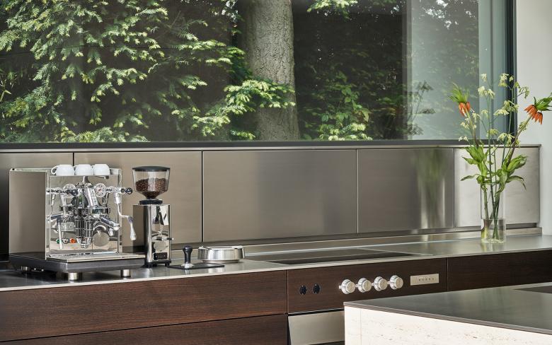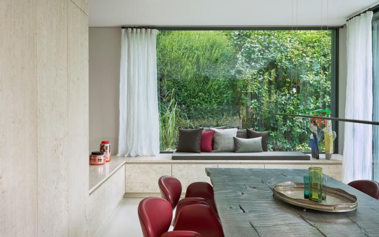 Eine frei im Raum stehende Kücheninsel, ein raumhoher Schrankblock in der Raummitte und ein brüstungshoher Windowseat mit Blick auf eine üppige Pflanzenhecke zum Nachbargrundstück. Hinter dem Sofa im Wohnbereich sind außerdem noch eine Heizkörperverkleidung und ein Couchtisch aus Travertin gefertigt.