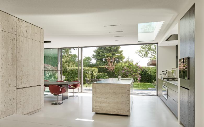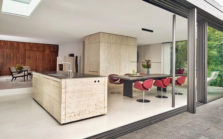 Der Frankfurter Stadtteil Bergen liegt am Rande des Naturschutzgebietes Berger Hang. Das Einfamilienhaus stammt aus den 1970er Jahren. Dank eines neuen Anbaus mit großzügigen Glasflächen liegen Wohnräume und Küche nun ebenerdig zum Garten. Zur bauzeitlichen Einrichtung gehören der offene Kamin und eine Wandvertäfelung aus Palisanderholz, hinter der sich die Hausbar befindet. Die Feuerstelle des Kamins ist seit jeher mit Römischem Travertin bekleidet, dessen sandfarbene, poröse Oberfläche mit unzähligen kleinen Hohlräumen durchsetzt ist. Sämtliche neu entstandenen Einbauten sind ebenfalls aus Travertin gefertigt. Die natürliche Anmutung der zerklüfteten Naturstein-Oberfläche steht in einem spannungsvollen Gegensatz zu den geradlinigen Volumen, die aus dem Stein gebildet sind: