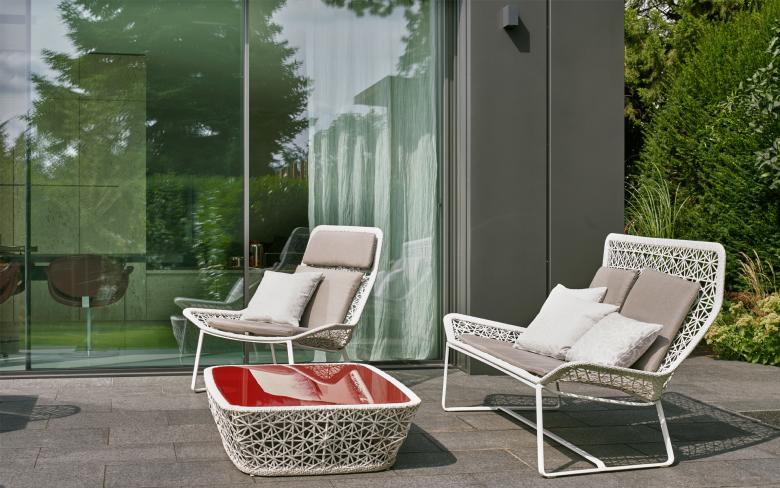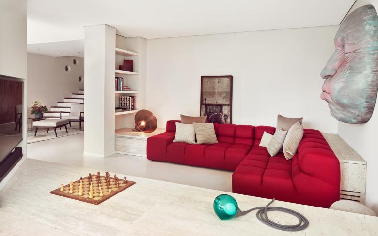 Die Farbtöne der Bodenbeschichtung und der Wände ist fein nuanciert auf den Travertin abgestimmt. Ein lockerer Mix aus verschiedenen Holz-Farbtönen verleiht den Räumen Wärme und Behaglichkeit. Farbiges Bindeglied sind kräftige Rottöne, auf die man aus den verschiedensten Blickwinkeln stößt. Doch nicht zuletzt ist es die Farbvielfalt des Gartens, die in den zurückhaltend gestalteten Räumen allgegenwärtig ist.