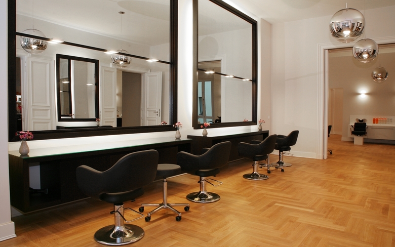 Trotz Erkern wirkt das Gebäude mit seiner Klinkerfassade und seinen großen Fenstern von außen recht nüchtern. Auch innen sind nach der Kernsanierung nur wenige Stilelemente aus dem 19. Jahrhundert erhalten geblieben: so zum Beispiel die profilierten hohen Doppelflügeltüren und vereinzelt Stuckdecken. In dem Spannungsfeld aus klassischen Altbau-Stilelementen und nüchternen vier Meter hohe Räumen ist die neue Innenarchitektur des Ladens entstanden. Eiche-Vollholzparkett ist durchgängig im Fischgrätmuster verlegt. Doch anders als bei der klassischen Diagonalverlegung aus Einzelstäben ist es hier mit Doppelstäben streng orthogonal angeordnet. Im Empfangsbereich sind verspiegelte Pendelleuchten in unterschiedlicher Größe an der prächtigen Stuckdecke zu einer Gruppe zusammengefasst. Im angrenzenden Schneideraum sorgen weiß gestrichene, profilierte Altbautüren und glatt gespachtelte weiße Wände für eine Atmosphäre schlichter Gediegenheit. Im farblichen Kontrast dazu hängen an den Wänden kubische Sideboards aus dunkeler Eiche und großformatige Spiegel, die in kantigen, hinterleuchteten Rahmen gefasst sind.