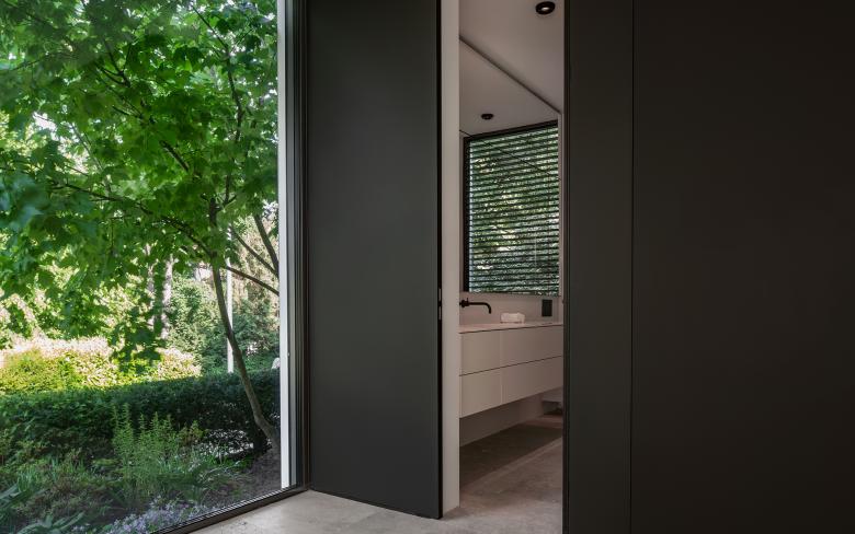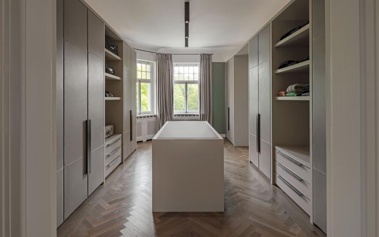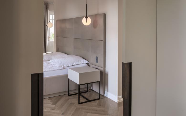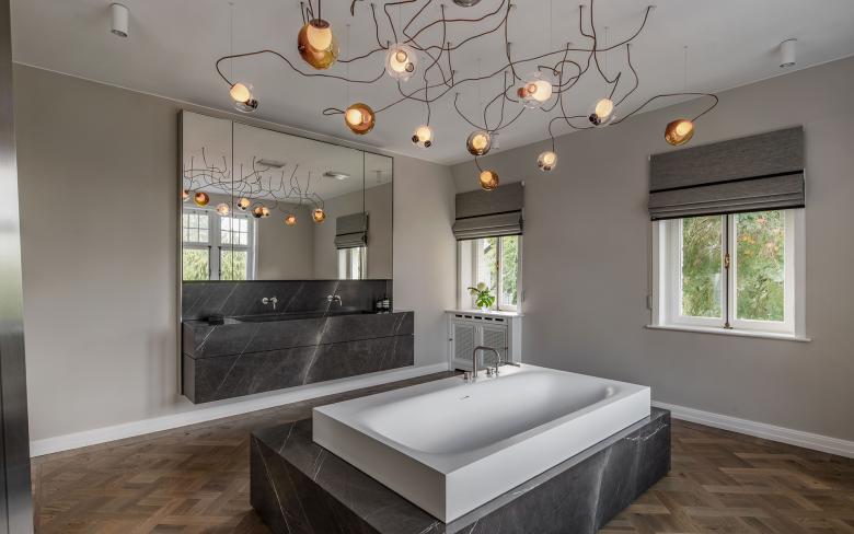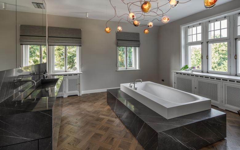 Die Privaträume liegen im Obergeschoss. Die Badewanne aus Mineralwerkstoff ist zur Hälfte in ein Podest aus dunkelgrauem Naturstein eingelassen. Weiße Calcit-Adern durchziehen den Stein und lassen ihn auf der Vorderseite des Podests wie einen massiven Gesteinsblock wirken. Dank filigraner Aufhängung scheint die Lichtskulptur über der Wanne zu schweben. An ihren gebogenen Kupferstäben hängen milchige und bernsteinfarbene Glaskugeln. Die Schrankfronten der Ankleide, die Ablagefläche des Wäscheblocks und die Bettrückwand sind mit Anilinleder in einem warmen, steingrauen Farbton bezogen. Das Schlafzimmer ist mit einer Klimaanlage ausgestattet. Die dafür erforderliche Anlagentechnik im Innenraum ist hinter den abnehmbaren Polsterkassetten der Bettrückwand verdeckt untergebracht.