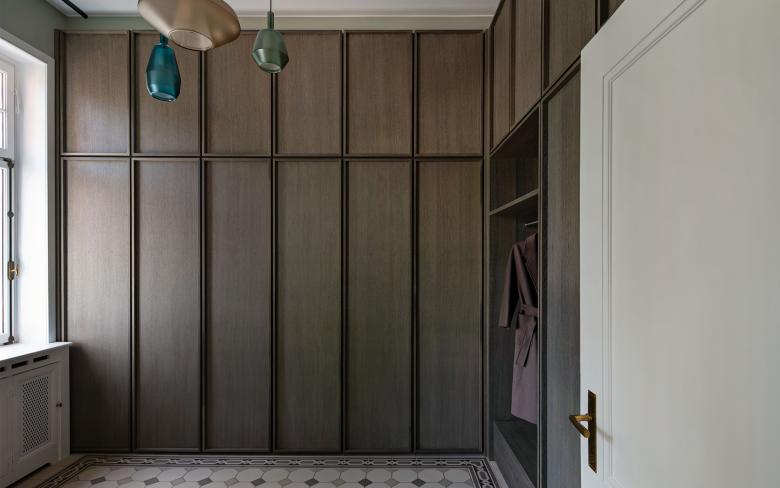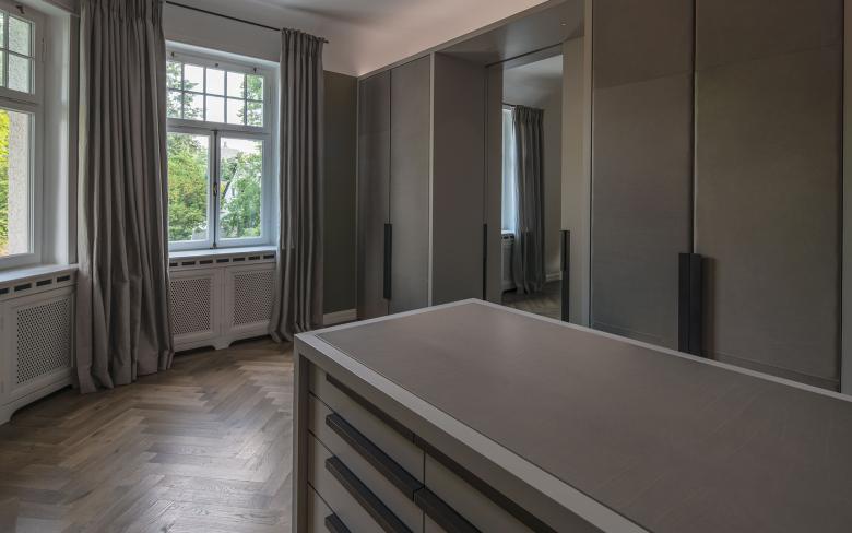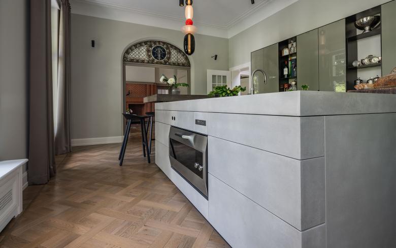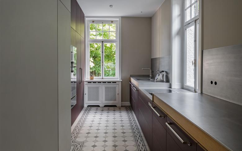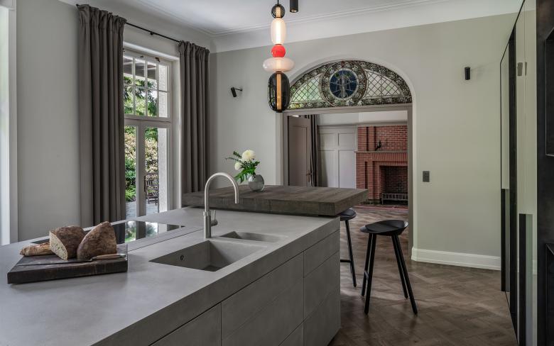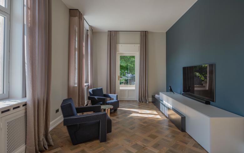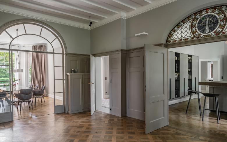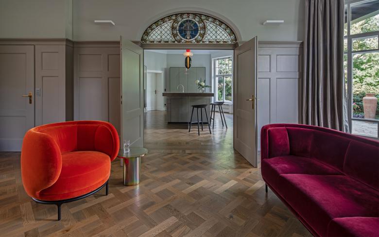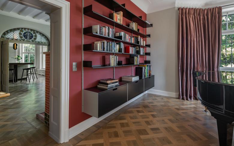 Fenster, Türen, das komplette Holzwerk, der Stuck und die historische Treppe im Eingangsbereich werden restauriert oder originalgetreu nachgebaut. Die neuen Bodenfliesen sind nach historischen Vorbildern aus gebranntem Feinstein-Steinzeug gefertigt. Die ebenfalls neuen Garderobenschränke aus geräuchertem Eichenholz bilden dank ihrer feingliedrigen Rahmenstruktur das stilistische Bindeglied in die heutige Zeit. Nach dem Entrée gelangt man in das zentrale Kaminzimmer. Von hier aus hat man Zugang zur Küche, zur Bibliothek und zum TV-Zimmer. Diese repräsentativen Wohnräume sind mit exklusivem neuem Tafelparkett aus geräuchertem Eichenholz ausgestattet. Die Wände des Kaminzimmers sind umlaufend mit einer kassettierten bauzeitlichen Wandbekleidung versehen. Der historische Kamin ist von dicken Farbschichten befreit und zeigt stolz seine rotes Klinkermauerwerk. Die neuen Eigentümer möchten in den anderen Wohnräumen auch gerne deutliche Farbakzente setzen. Die Wand hinter dem Fernseher ist tintenblau gestrichen und in der Bibliothek leuchtet die Wand hinter dem Regal von Dieter Rams in einem Fuchsia-Ton. Die Küche präsentiert sich farblich zurückhaltend. Die Küchenschränke sind eukalyptusfarben hochglänzend lackiert und in brünierten Flachstahlrahmen eingefasst. Über der zentralen Kochinsel aus grauem Beton sorgt die rote Glaskugel der Pepples-Leuchte von Boris Klimek für einen strahlenden Farbtupfer.