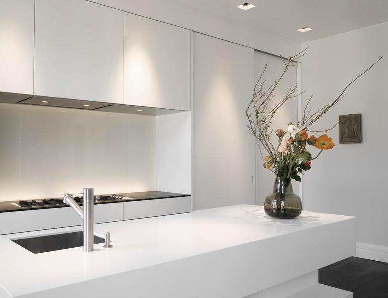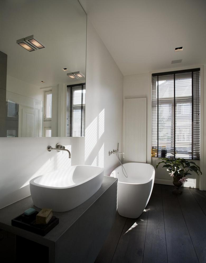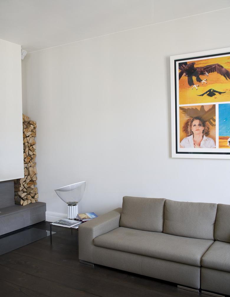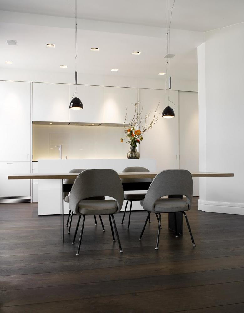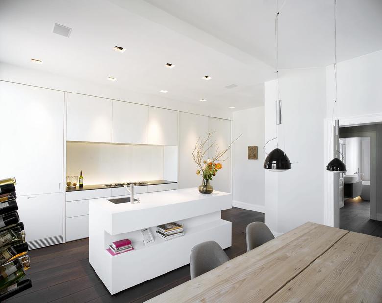 Die alten Türen, Sockelleisten und Fensterbekleidungen sind mühsam von dicken Farbschichten befreit worden. In der kompletten Wohnung liegen bis zu sechs Meter lange geräucherte Eiche-Schlossdielen. Die anderen Materialien halten sich gegenüber den dunklen Dielen farblich zurück. Die Küchenfronten und der frei im Raum stehende Küchenblock sind schneeweiß. Die Kaminbank und die Natursteinarbeiten im Bad sind aus grauem Kalkstein, der bei genauer Betrachtung eine leicht wolkige Struktur hat. Auch die Wandfarbe spielt mit Grautönen, die auf die Einrichtung jedes Raums abgestimmt ist.