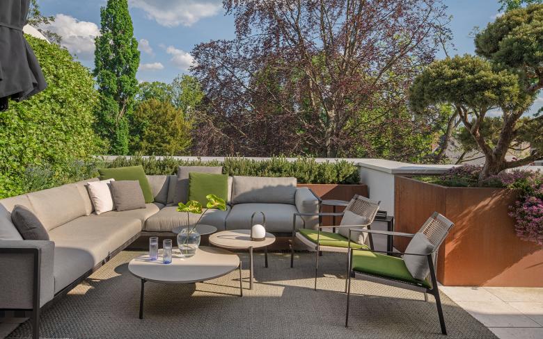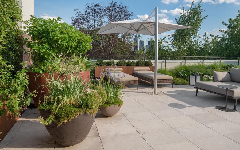 Von der Dachterrasse hat man einen beeindruckenden Blick über den dichten Baumbestand der umliegenden Gärten bis zu den Banktürmen der Finanzmetropole. Dem Wunsch der Bewohner nach hochwertigen, natürlichen Baumaterialien folgend, sind die Pflanzkübel aus handgeformtem Ton und maßgefertigtem Cortenstahl gefertigt.