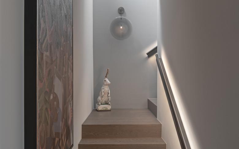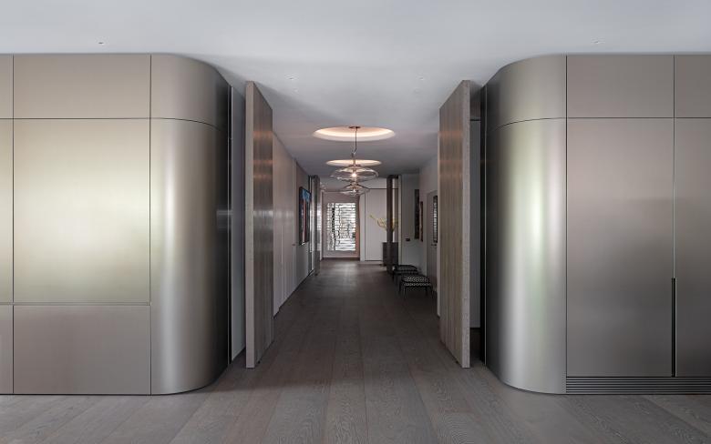 Betritt man die Wohnebene über den Aufzug oder eine interne Treppe, steht man in einem Flur, dessen Anfang und Ende von einer schnurgeraden Wandfläche mit flächenbündig integrierten Türen und Schränken beschrieben wird. Diese Flurzone bildet das organisatorische Rückgrat des Staffelgeschosses. Zwei doppelflügelige Pivottüren, die einander exakt gegenüber liegen, gliedern diese Wohnebene in drei Bereiche: links der Schlaftrakt, in der Mitte das Entrée mit angrenzendem Gäste-/Arbeitszimmer und auf der rechten Seite der offene Wohnbereich. Die geöffneten Türen schmiegen sich an die jeweils hinter ihnen liegende Wände und ermöglichen somit den fließenden Übergang vom Wohnen zum Schlafen.