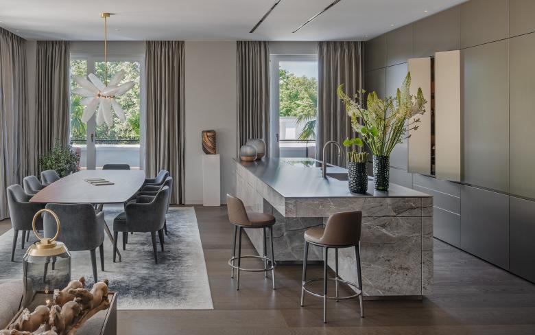 Das Farb- und Materialkonzept basiert auf Bronzefarbtönen in verschiedenen Schattierungen, die mit edlen Naturmaterialien kombiniert werden, wie Anilinleder in den Füllungen der Rahmentüren der Ankleide, gebürstetes Messing und venezianisches Glas bei den dekorativen Leuchten. Ein besonderes Augenmerk gilt der Kochinsel, deren Fronten aus fein geädertem Marmor gefertigt sind. Mit Ausnahme der Bäder sind auf allen Böden großformatige, dunkle Holzdielen verlegt.