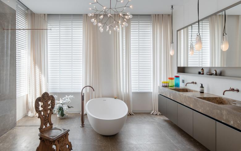 In den Bädern treffen Bronzearmaturen auf Naturstein, dessen Farbton sich von Bad zu Bad unterscheidet. Im Masterbad ist es ein milchkaffeefarbener Dolomit aus dem Altmühltal, im Duschbad der schwarz-braune „Pietra d´Avola“ von den toskanischen Natursteinspezialisten Salvatori und im Gästebad im 1. Obergeschoss ist es der helle Sandstein „Crema D´Orcia“, ebenfalls von Salvatori.