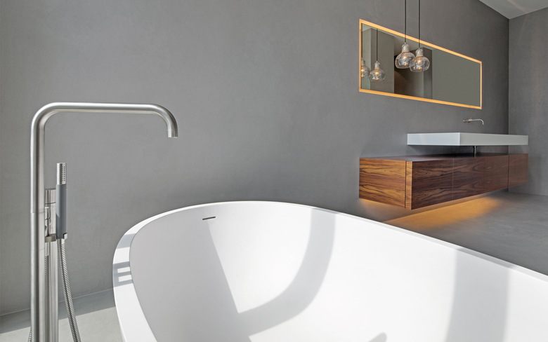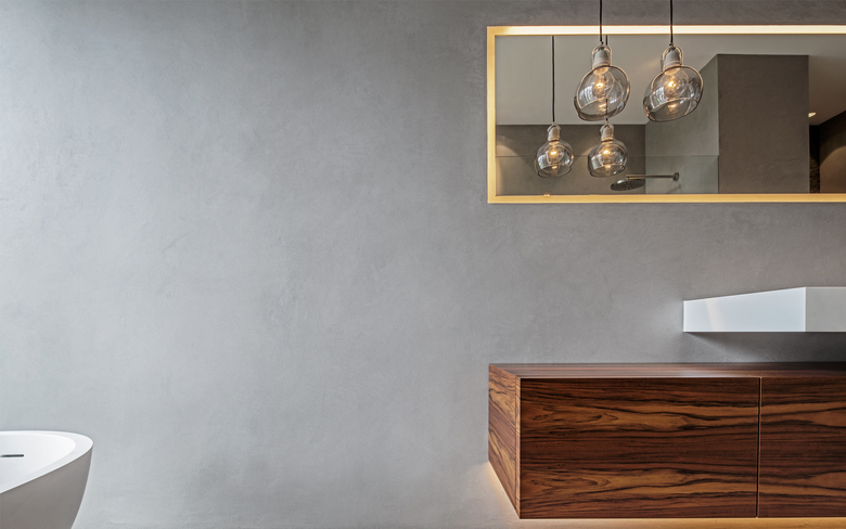 Boden und Wände in beiden Bädern sind mit einer fugenlosen, feuchtigkeitsunempfindlichen Beschichtung versehen. Im Masterbad steht eine ovale weiße Wanne hinter bodentiefen Fenstern frei im Raum. Sie löst sich aus der puren Betonoptik gespachtelter Oberflächen, ebenso wie die Wachtischmöbel und eine Wand aus dreidimensionalen Natursteinmosaik-Fliesen.