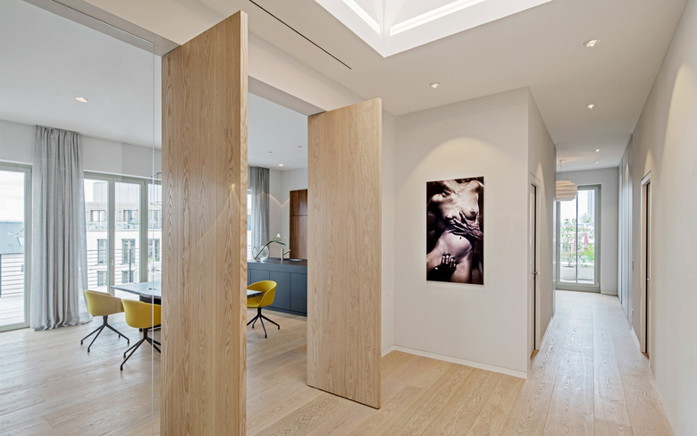 Das Penthouse liegt am Rande des Frankfurter Bankenviertels im südlichen Westend. Es ermöglicht weitläufige Ausblicke auf die Stadt. Der Grundriss sorgt für fließende Raumabfolgen und eröffnet unerwartete Sichtbezüge. Von der Diele aus betritt man den Wohn-Essbereich über zwei Pivot-Türen aus Eichenholz. Sie sind aus dem gleichen Material gefertigt wie der Dielenboden. Zur einen Seite des Esstischs gibt ein Panoramakamin Einblick in das benachbarte Wohnzimmer. Zur anderen Seite öffnet sich die Küche. Die Kochinsel ist aus matt-schwarzem Nanotech-Material gefertigt. In der dahinter liegenden Nussbaum-Schrankwand sind weitere Küchenfunktionen und der Zugang zum Hauswirtschaftsraum untergebracht.