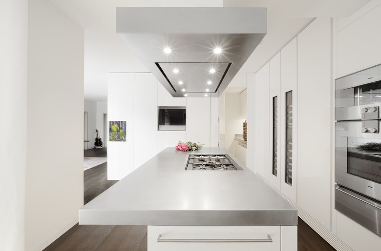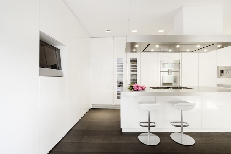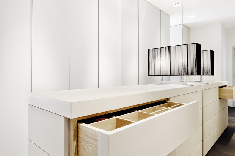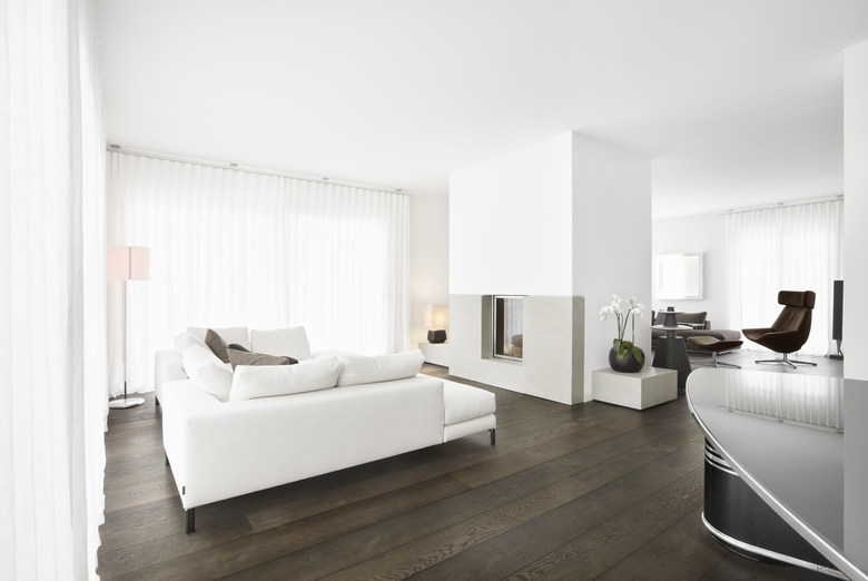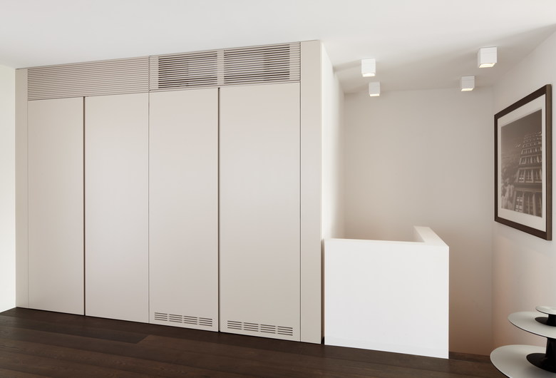 Die Wohnung verbindet exklusive Schlichtheit mit Eleganz. Die matt lackierten Kleiderschränke zum Beispiel verraten ihre eigentliche Finesse erst wenn man sie öffnet. Innen sind sie vollständig aus hellem Eichenholz gefertigt. Aus den Hochschränken der Küche entwickelt sich schneeweiß und hochglänzend eine raumhohe Wandbekleidung.