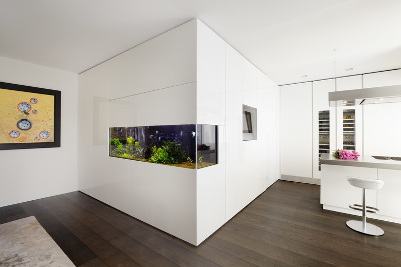 Die Tür zum Hauswirtschaftsraum ist als solche kaum erkennbar, und die technische Ausrüstung des Aquariums verschwindet genauso selbstverständlich hinter weißen Lackfronten wie die Tür nebenan nicht vermuten lässt, dass hinter ihr Bleikristallgläser in Reihe stehen.