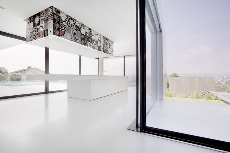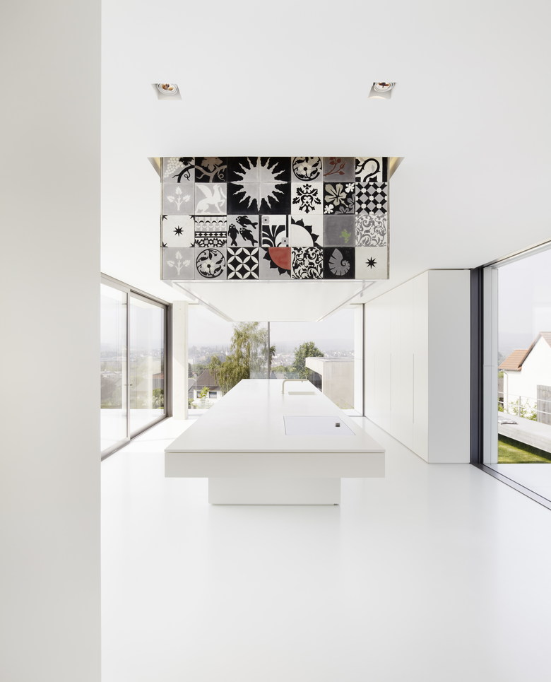 Der Blick durch die großen Fenster fällt auf den Schlossberg, weiter unten liegt der Ort. Ansonsten viel Weiß - Fußboden, Möbel, Decke, alles ist weiß. Neben dem Eingang nimmt die Kochinsel einen prominenten Platz ein. Direkt dahinter steht mitten im Raum ein weiß lackierter Kubus. Was jedoch wirklich ins Auge sticht ist das Deckenelement über der Kochinsel. Es ist ein in Zement gegossenes Sammelsurium an marokkanischen Ornamenten, das mit seiner Umbebung in Wechselbeziehung tritt. So kommen das technisch anmutende Weiß und die verspielten handgearbeiteten Fliesen erst durch die Gegenwart des anderen zur Geltung.