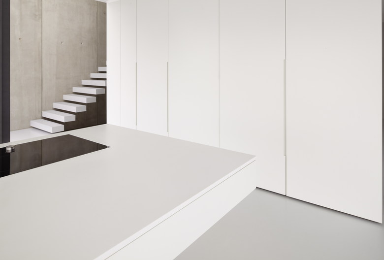 Dabei steht bei der Planung weniger das Sichtbare im Blickpunkt, als das was verborgen ist. So ist zum Beispiel die Kochinsel gleichzeitig Frühstücksplatz. Hinter glatten Lackfronten lässt sich zu beiden Seiten eine Sitzbänke aus ihrem Rumpf herausfahren. Der geschlossene Kubus wirkt von außen unauffällig. Eingefräste Grifffugen verraten, dass sich hinter der ruhigen Front noch mehr verbirgt. Mit einer zweiten Küche, einer Garderobe und einem WC greifen hier komplexe Räumgefüge ineinander.
