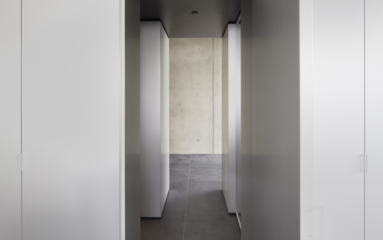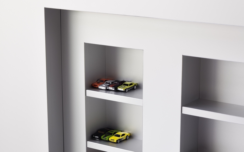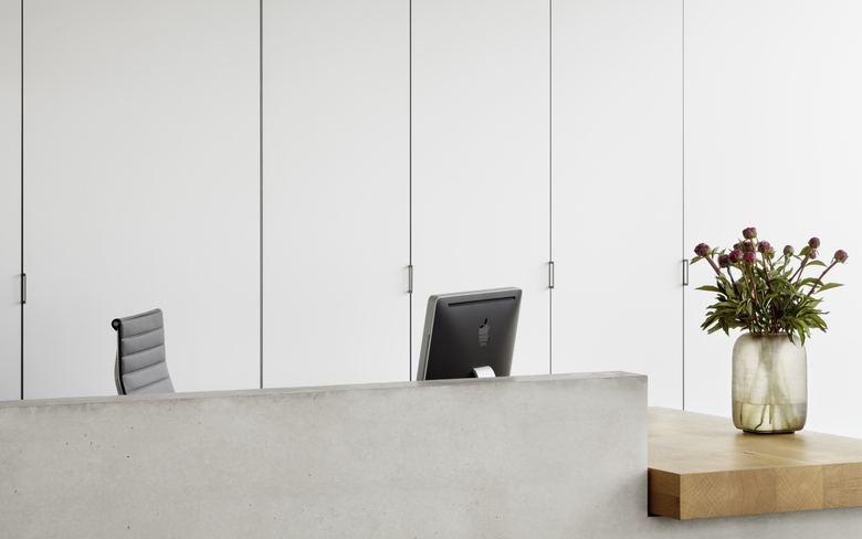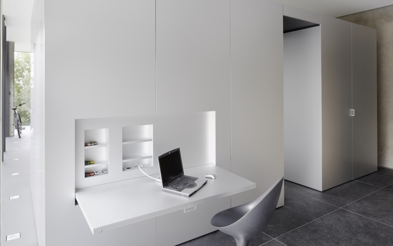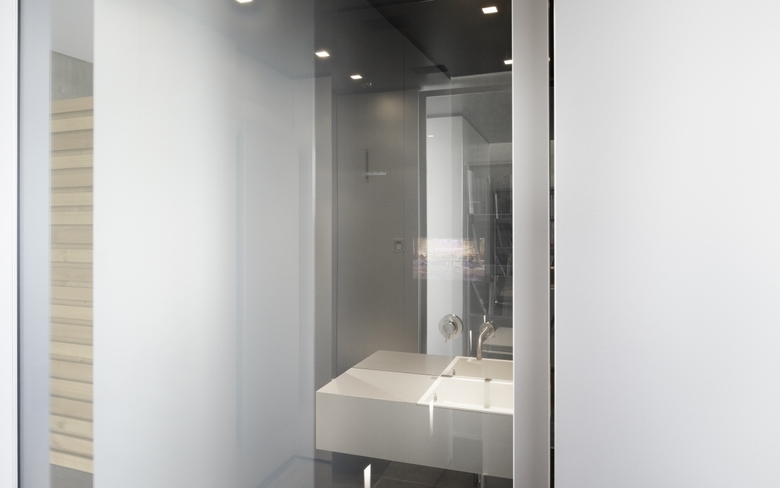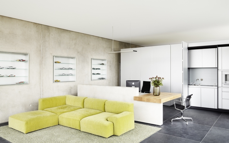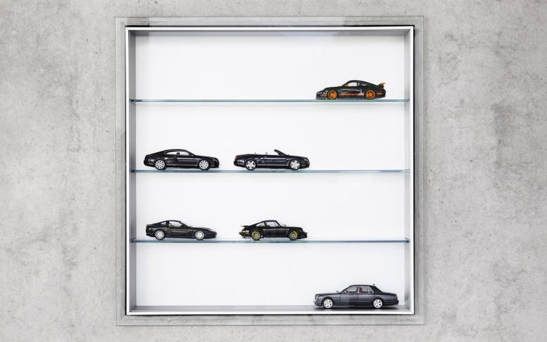 Ob Bentley oder Porsche, das Geschäftsfeld von Soho Automobile sind Luxuskarossen. Das Bürogebäude der Agentur ist ein zweiseitig verglaster kubischer Baukörper, dessen pure und schnörkellose Formensprache sich auch im Inneren mit Sichtbeton, Glas und graphitgrauem Naturstein fortsetzt. Herzstück des Gebäudes ist ein frei im Raum stehender, allseitig auf Gehrung gefertigter Kubus. Hinter seinen unauffälligen Türen verbergen sich Stauraum für Büromaterial, eine Pantryküche und ein Duschbad. Die Fronten sind aus Aluminium gefertigt, dessen eloxierte Oberfläche das Tageslicht mit zartem Schmelz reflektiert. Für den Besucher im ersten Moment irritierend ist die transparente Glastür zum Bad. Erst wenn man das Licht im Bad anschaltet, wird das Glas, das auf elektrische Spannung reagiert, milchig-weiß. Einer ähnlichen Überraschung begegnet man am Waschtisch. Hinter dem getönten Spiegel ist ein Fernseher eingebaut. Ist er eingeschaltet, wird sein Bildschirm auf der Spiegelfläche sichtbar.