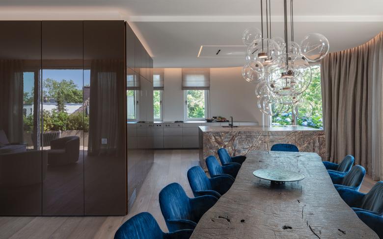 Zentral und frei im Raum steht ein glänzender Möbelkubus. Auf seiner Oberfläche spiegelt sich der umgebende Raum. Die Kochinsel ist aus Naturstein gefertigt, auf dessen gebürsteter Oberfläche sich ein Geflecht aus Gesteinsadern in unterschiedlichsten Braunschattierungen abzeichnet. Die Platte des Esstischs besteht aus vier Meter langen, geköhlten Eichenbohlen, deren unbesäumte Tischkanten den natürlichen Wuchs des Baums beschreiben. Im angrenzenden Wohnzimmer ist die Wandbekleidung über dem Kamin aus vor- und zurückspringenden rostbraunen Steintafeln gefertigt. Auf Knopfdruck fahren die beiden zentralen Steintafeln zur Seite und geben den Blick auf einen Fernseher frei.