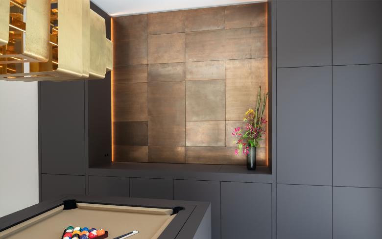 Das Herzstück des Erdgeschosses ist ein Aufenthaltsraum mit Billardtisch und Küche, der dazu einlädt, Gäste zu empfangen und Partys zu feiern. Mittig über der Feuerstelle ist die Maserung des polierten Marmors gespiegelt angeordnet. Das Farbspiel im Steins changiert von Beige, über Taupe zu Anthrazit und ist durchzogen mit weißen Kristalladern. Als Kontrast zu dem eleganten Marmor ist der Bodenbelag ein geschliffener Sichtestrich, der ursprünglich dem Industriebau entstammt. Er ist mit extraweißem Zement hergestellt und weist fertigungsbedingt leichte Farbunregelmäßigkeiten auf. Ein ähnliches Kontrastprinzip taucht im Nebenraum auf. Die Fronten der Küchenschränke und des Billardtischs sind aus einem graubraunen, matten Nanotech-Material hergestellt, das sich durch seine gleichmäßige Oberfläche auszeichnet. Die Rückwand der Küchennische hingegen ist mit bronzefarbenen Flüssigmetalltafeln belegt, die dank ihres handwerklichen Auftrags einen imperfekten Farbverlauf haben.
