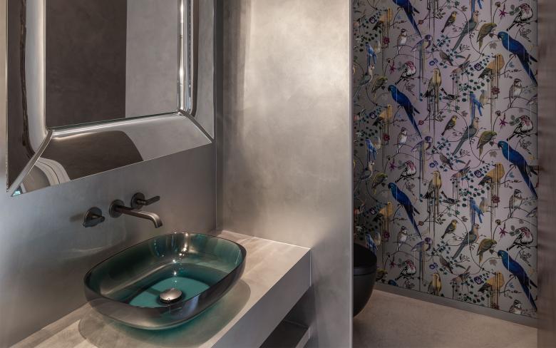 Einige Wände der Gästetoilette haben ein Tapetenmotiv mit exotischen Vögeln und grafischen Farbverlaufslinien. Die restlichen Wände sind mit einem wolkigen Farbauftrag im silbrigen Grundton der Tapete gestaltet.