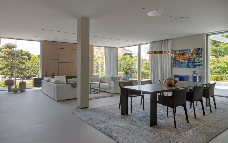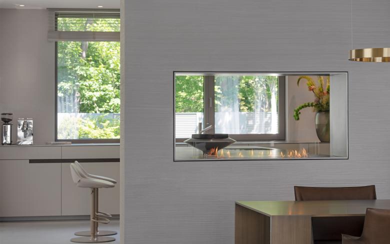 Durchgängige, glatte Deckenflächen sorgen für fließende Raumfolgen in Erd- und Untergeschoss. Die Zimmertüren sind rahmenlos und raumhoch. Schwellenlos und ebenfalls raumhoch sind die filigran gefertigten Glasschiebetüren zum Garten. Der Ausblick in die Natur wirkt bei geschlossenen Fenstern nahezu unverstellt. Statt herkömmlicher Sockelleisten bildet eine zwei Zentimeter hohe Schattenfuge den Übergang von Fußboden zur Wand. Bei den raumhohen Einbauten beträgt der Abstand der Möbelfronten zum Boden und zur Decke ebenfalls nur zwei Zentimeter. Alle Deckeneinbauleuchten sind bündig und rahmenlos eingebaut.