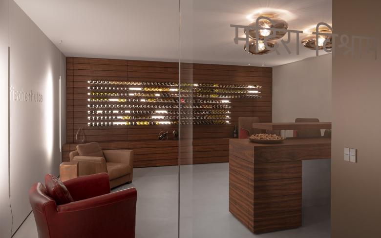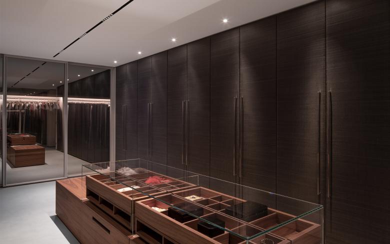 Im Untergeschoss ist der Farbton Ecru mit hellem Sandstein und Möbeln aus Nussbaum kombiniert. In der Ankleide sind die Glasschiebetüren auf den Stirnseiten halb verspiegelt. Bei eingeschalteter Schrankinnenbeleuchtung wird die Kleidung somit auch von außen sichtbar. Die Schranktüren auf den Längsseiten sind mit graphitfarbenem Rosshaar bezogen.
