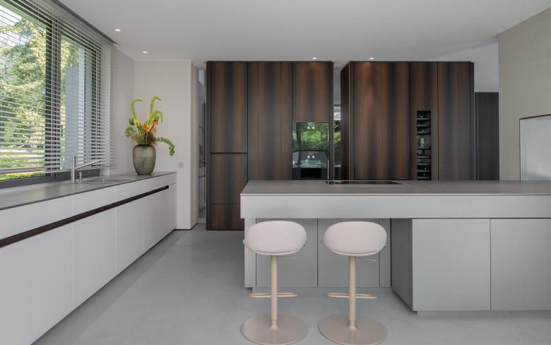 Raumhohe, dunkle Möbelkuben aus geräucherter Eiche prägen die Gestalt der Wohnräume. Der Fernseher im Wohnzimmer ist hinter einer Wandbekleidung aus naturbelassenen Lederpaneelen verborgen. Auf Knopfdruck verschwindet das mittlere zentrale Paneel hinter der Wandbekleidung und der Fernseher fährt heraus. In der Küche sind die Fronten und die Arbeitsplatte des Kochblocks aus Edelstahl gefertigt.