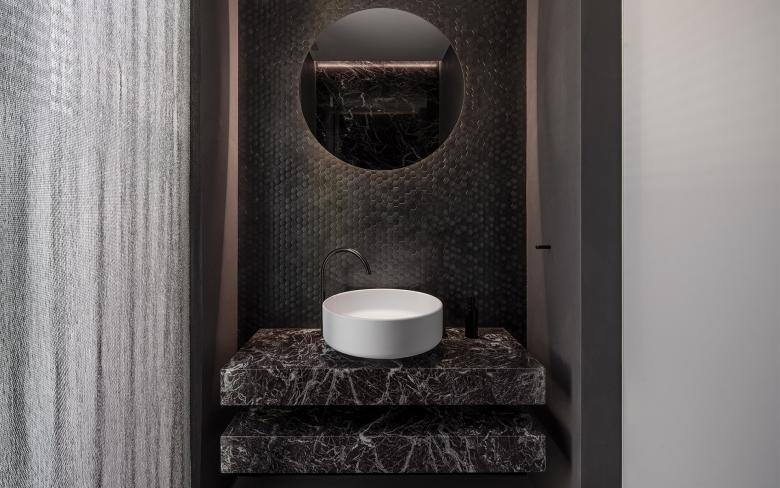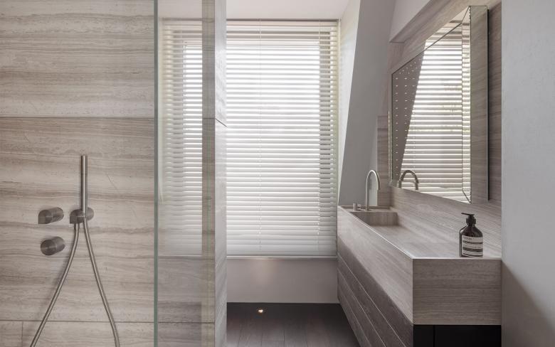 Im kompletten Dachgeschoss ist ein Dielenboden aus Akazienholz verlegt. Dessen dunkler Farbton hebt sich kontrastreich von dem hellen Naturstein im Gästebad ab. Die Oberfläche des hellgrauen Marmors ist zumeist glatt. Auf der Waschtischrückwand hingegen ist sie als sogenanntes „Bamboo-Relief“ gearbeitet.