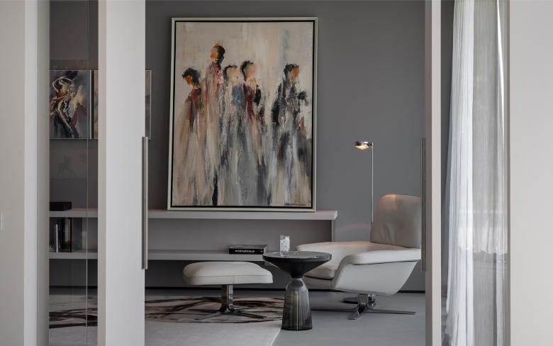 Das Haus liegt in einer Bungalowsiedlung südlich von Frankfurt. Unsere Kunden wünschen sich geradlinige, formal reduzierte Innenarchitektur mit heller Grundstimmung, in der ausdrucksstarke Kunst gut zur Geltung kommt. Die Umsetzung fordert anspruchsvolle Ausbaudetails und ein hohes Maß an handwerklichem Können.