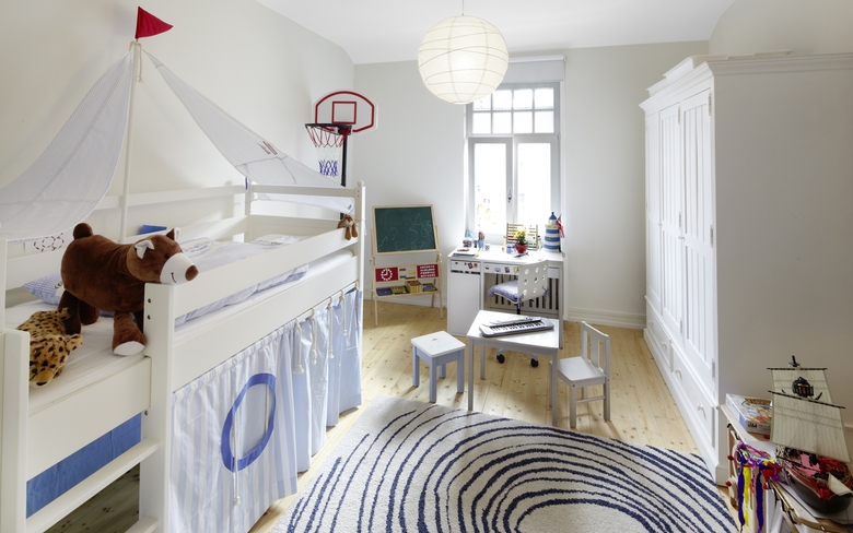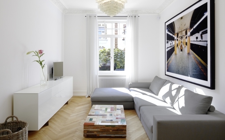 In der Küche wird die schnörkellose Coolness schneeweißer, griffloser Möbel durch Ablageborde gebrochen, auf denen Kochutensilien für ein angenehmes Maß an Unordnung sorgen. Der mit zahlreichen Gebrauchsspuren versehene Esstisch diente einst einer Werkstatt als Arbeitstisch. Im benachbarten Wohnzimmer sind Fernseher und Audiotechnik in einem Sideboard aus matt glänzendem Acrylwerkstoff verbaut. Ein Couchtisch aus Abfallholz von Piet Hein Eek und ein weiterer Vintage-Kronleuchter vervollständigen den Stilmix.