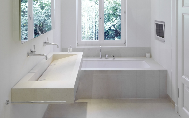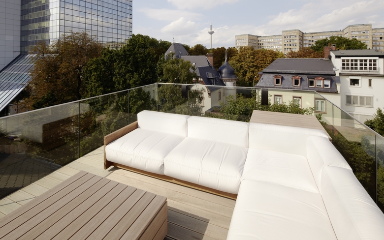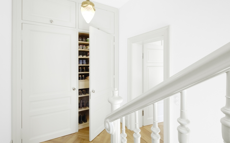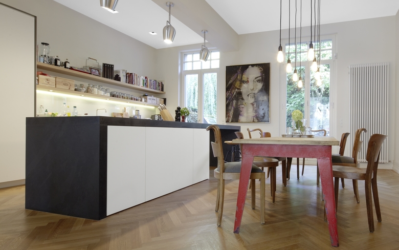 130 Jahre lang hat dieses Wohnhaus im Frankfurter Westend seinen Altbaucharme bewahrt, obwohl mit den Jahren so manches Stilmerkmal aus der Gründerzeit verloren gegangen ist. Angelehnt an das Erdgeschoss ist im 1. Obergeschoss neues Eiche-Fischgrät-Parkett verlegt worden. Die Holztreppe hat ein neues, für die Gründerzeit typisches Geländer erhalten und passend zu den Zimmertüren steht auf dem Treppenpodest heute ein Garderobenschrank mit profilierten Fronten. In den Wohnräumen entfaltet sich der persönliche Stil der Bewohner: eine legere Mischung aus Purismus und Vintage-Design eingebettet in des Flair eines Stilaltbaus. In der Ankleide laufen schlichte große Schiebetüren vor den Raum hohen Kleiderschränken. In einer der Türen spiegelt sich eine Glas-Pendelleuchte aus den 60er Jahren.