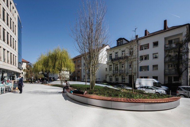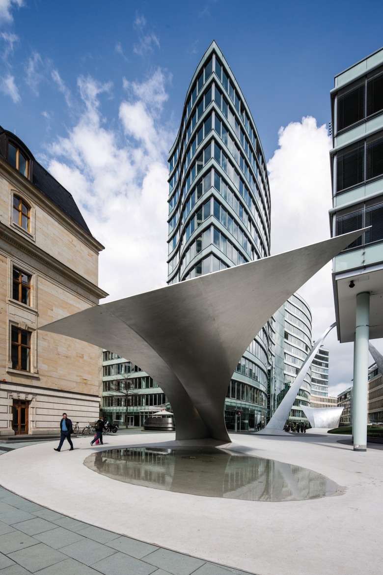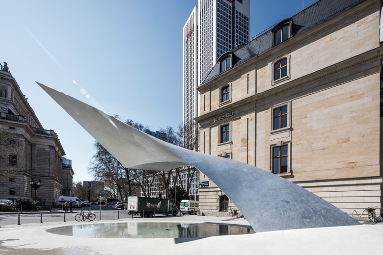 Auch der neue Boden des Areals führt die Begrifflichkeit fort: Der hell-pigmentierte Gussasphalt verläuft durch die Freifläche, als sei er eine Flüssigkeit, die sich dort ihren Weg bahnt. Durch das Auf und Ab ergeben sich an manchen Stellen Wasserbecken, die einige der Aluminiumwellen wörtlich eintauchen lassen. So lässt der Entwurf neben der Skulptur aus silber-grauem, matt-geschliffenem Aluminium als raumbildendem Element einen Mix aus begrünten Flächen, Wasserläufen und Ruhezonen entstehen.