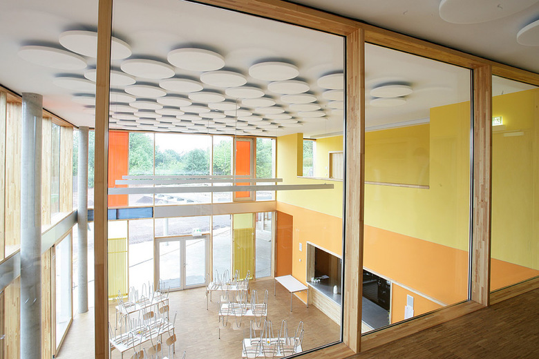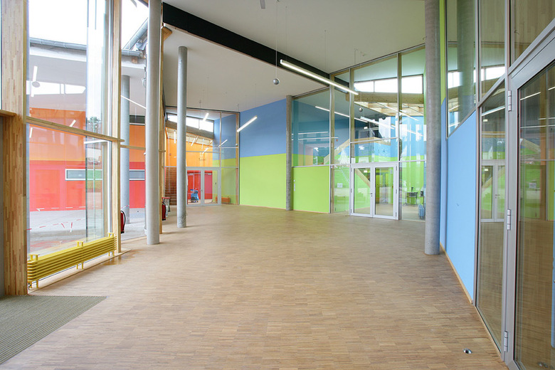 Technische Besonderheiten und Innovationen: Weit gespannte Flachdecken, Spannbetonhohldielendecke über der Sporthalle, optimierte Flächengründung mit Baugrundverbesserung durch Rüttelstopfsäulen vor dem Hintergrund bergbaulicher Randbedingungen.