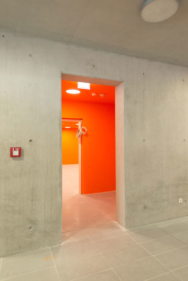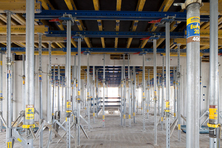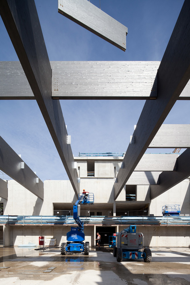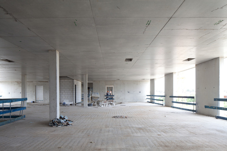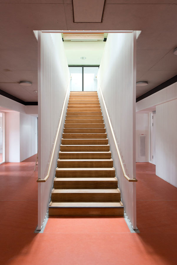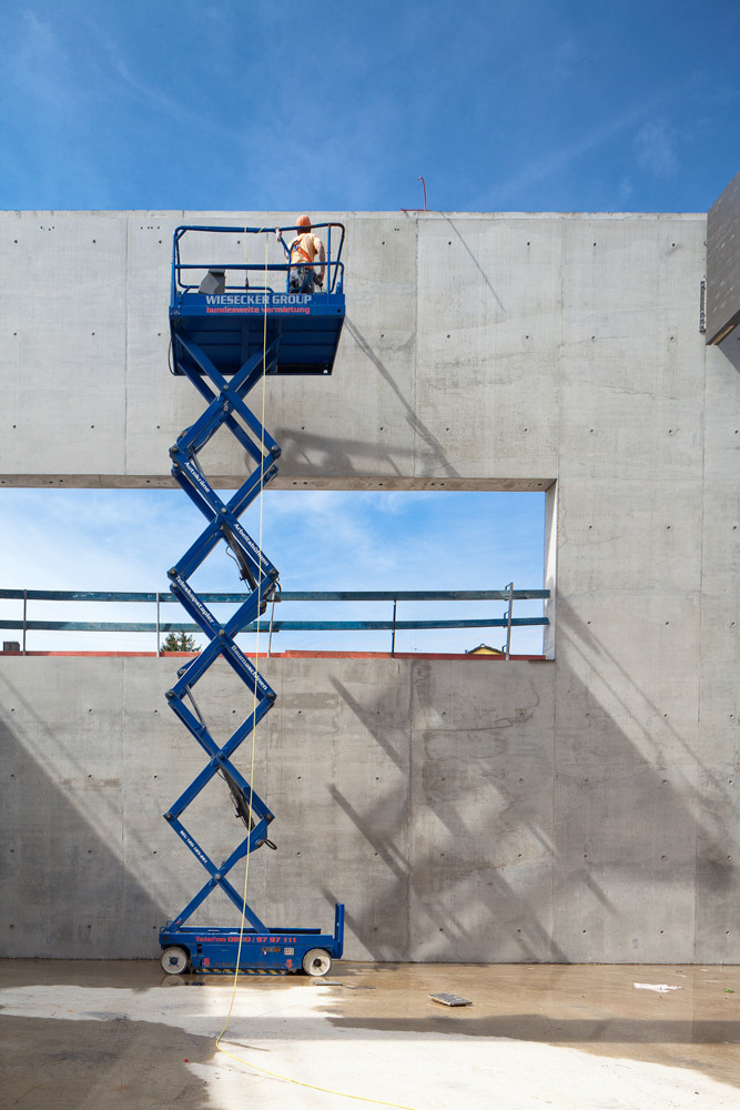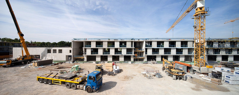 weigespannte Flachdecken, Passivhausbauweise auf thermisch getrennter Tiefgarage im Grundwasser, weitgespannte Brettschichtbinder (40 m)